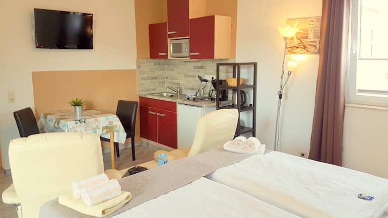 Das 1-Raum-Appartement „Amrum“ für bis zu 2 Personen, befindet sich im 1. Obergeschoss des Hauses „Gästehaus Felix“ im Bäckergang. Die Wohnung liegt zentral und hat einen Balkon.